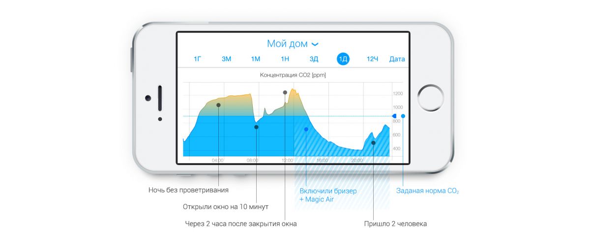 Базовая станция MagicAir предназначена для оценки качества воздуха и управления приборами в автоматическом режиме или с помощью Вашего смартфона. Например, когда в помещении становится душно и превышен заданный уровень CO2, MagicAir автоматически включит бризер на проветривание. А при помощи терморегулятора Danfoss MagicAir будет поддерживать комфортную температуру воздуха за счет регулировки мощности батареи отопления.