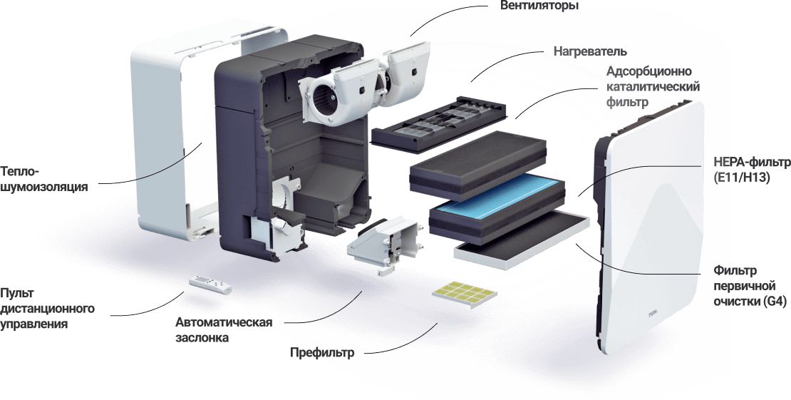 Медицинский стандарт очистки воздуха с помощью каскада фильтров (в комплектации Family, Plus и Magic) - префильтр G4 - улавливает крупные частицы такие как пух, пыль и тд.; HEPA H13 - блокирует мельчайшую пыль, аллергены, бактерии, грибки, вирусы; AK-XL - нейтрализует неприятные запахи такие как гарь, отработанные газы, пищевые запахи и тд.