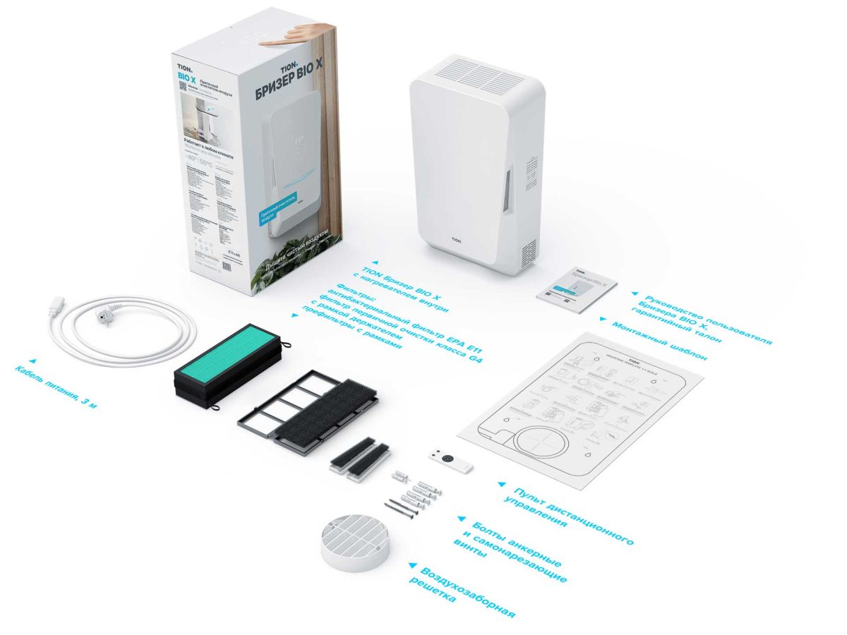 Бризер Tion BIO X совмещается с воздухозаборным каналом. При помощи монтажного шаблона и крепежных элементов, входящих в комплект поставки бризера, фиксируется на стене и подключается к обычной электро-розетке с напряжением 220В.