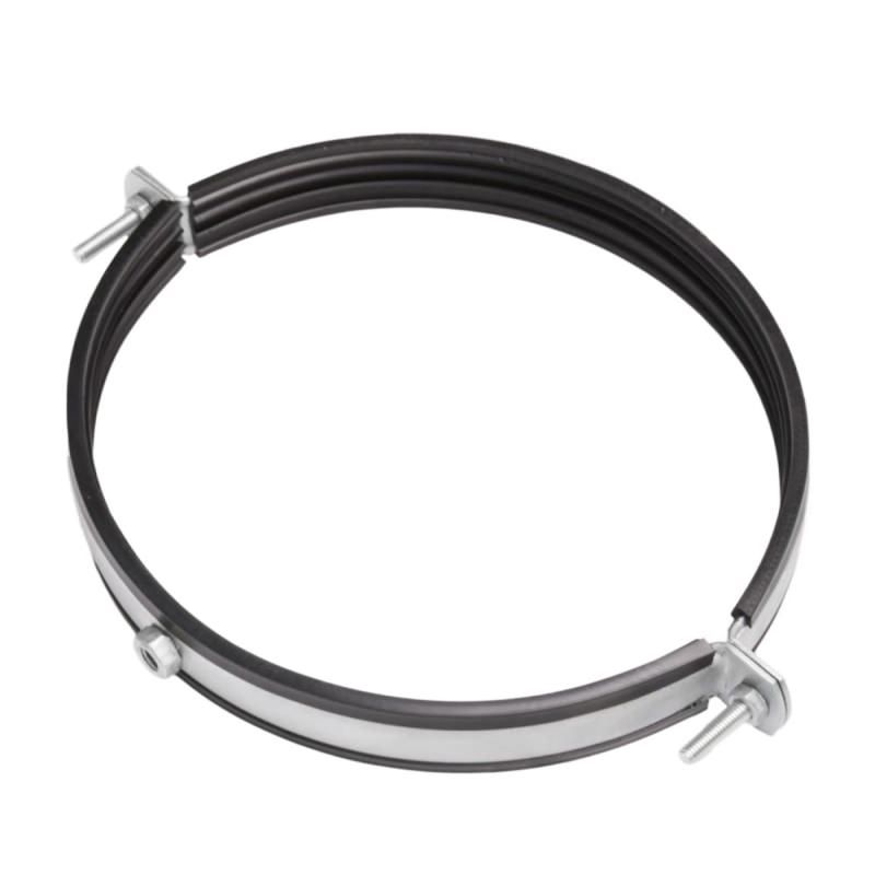 Вентиляционные металлические хомуты с резиновым профилем и гайкой М8 применяются для горизонтального крепления либо подвеса воздуховодов, пластиковых и металлических труб, кабелей, жгутов на резьбовые шпильки М8. Хомуты имеют специальные резиновые уплотнительные подкладки, которые уменьшают вибрацию, передаваемую на крепеж и частично снижают уровень шума. Благодаря оцинкованному покрытию толщиной 8-10 микрон хомуты устойчивы к абразивному износу, старению и солнечному излучению, воздействию сред с высоким содержанием паров спирта, кислот, влаги. Легко и надежно собираются с помощью винтов, входящих в стандартную комплектацию. Рекомендуемая нагрузка на один вентиляционный хомут - 20 кг, предельная нагрузка - 60 кг. За счет резинового уплотнителя хомуты частично компенсируют температурные расширения.