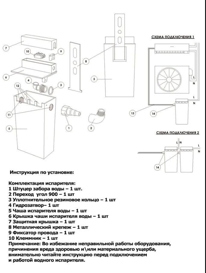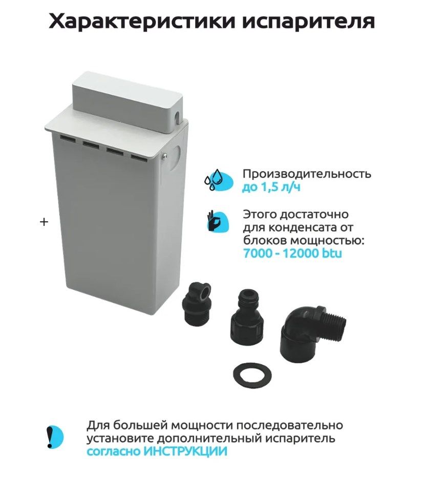 Электронный испаритель влаги предназначен для испарения конденсата образующегося в результате работы бытового кондиционера. Прибор монтируется на улице рядом с наружным блоком сплит-системы, дренажная трубка ведущая от внутреннего блока сплит-системы заводится в испаритель. При работе кондиционера конденсат через дренажную трубку попадает в испаритель, далее при наполнении емкости конденсатом, прибор автоматически включается и начинает испарять накопленный конденсат в атмосферу через специальные отверстия. Процесс испарения происходит за счет превращения воды в горячий пар работе нагревателя.