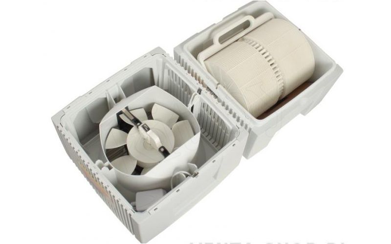 Воздух насыщается влагой на молекулярном уровне, одновременно мелкие частицы грязи прилипают к пластинам барабана и затем смываются с их поверхности в поддон с водой. Благодаря способности воды удерживать мельчайшие частицы размером от 10 микрон (10/1000 мм) такие, как: домашняя пыль (включая пылевых клещей), пыльца растений, аллергены, альдегиды табачного дыма, вся воздушная взвесь остается в приборе и уже не способна вместе с увлажненным воздухом попасть обратно в помещение. Увлажненный и очищенный воздух выходит через боковые решетчатые стенки прибора.