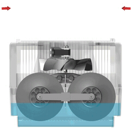 Воздух затягивается внутрь мойки через верхнюю часть и проходит сквозь пластинчатый барабан. Барабан медленно вращается в воде.