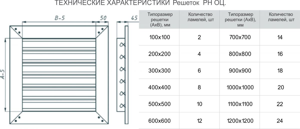 *Минимальный размер АхВ (присоединительный диаметр) наружной металлической решетки РН-оц. — 100х100 мм. Решетки со стороной B ≥ 1200 мм дополнительно усиливаются вертикальной перемычкой.