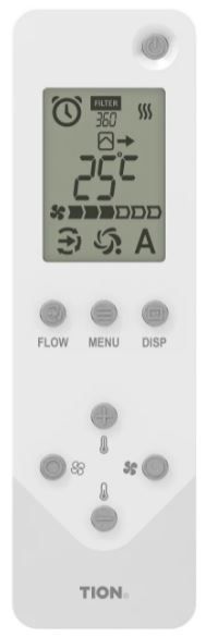 Пульт дистанционного управления Tion RC02 разработан для удаленного управления по Bluetooth устройствами приточной вентиляции Tion 4S, Tion 3S, Tion Lite. С его помощью можно регулировать температуру подогрева воздуха, скорость потока воздуха, а также настроить таймер включения и выключения устройства. ЖК-дисплей показывает, сколько дней осталось до замены фильтров.